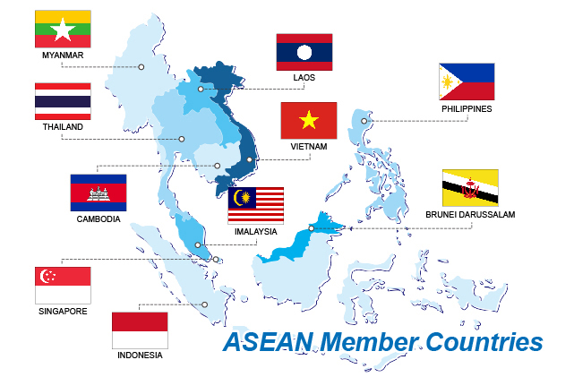 东南亚国家协会(The Association of Southeast Asian Nations, ASEAN)简称「东协」,於1967年8月8日在曼谷成立,五个创始会员国为印尼、马来西亚、菲律宾、新加坡及泰国。其后文莱於1984年1月8日加入、越南於1995年7月28日加入、老挝和缅甸於1997年7月23日加入,柬埔寨於1999年4月30日加入,形成东协10国,持续至今。
